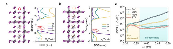 图2. 用DFT计算VAPb (a)和VASn (b)的能级深度;(c) 对照组、EDAI、PEAI和STA的TAS图。