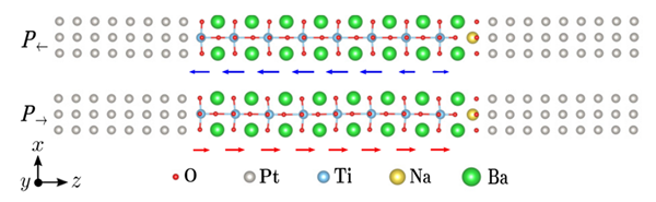 图1. BaTiO3厚度为8.5 u.c.的NaTi-FTJ的左极化态(a)和右极化态(b)的原子结构示意图。蓝色和红色的箭头标明了左右两种极化态中BaTiO3的局部极化。