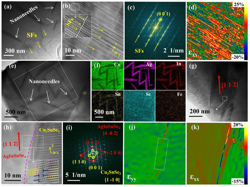 近期,中科院合肥研究院固体物理研究所能源材料与器件制造研究部秦晓英研究员课题组在Cu2SnSe3材料体系热电性能调控方面取得新进展。研究人员通过在Cu2SnSe3化合物中构建高密度堆垛层错与内生纳米针(nanoneedle)来散射中低频声子并大幅提升了其热电性能,使得Cu2Sn0.88Fe0.06In0.06Se3-5wt.%Ag2Se样品的热电优值ZT在848K时高达1.61,相关研究结果以 “Creating high-dense stacking faults and endo-grown nanoneedles to enhance phonon scattering and improve thermoelectric performance of Cu2SnSe3” 为题发表于Nano Energy (Nano Energy, 2022, DOI: https://doi.org/10.1016/j.nanoen.2022.107510 ) 上。