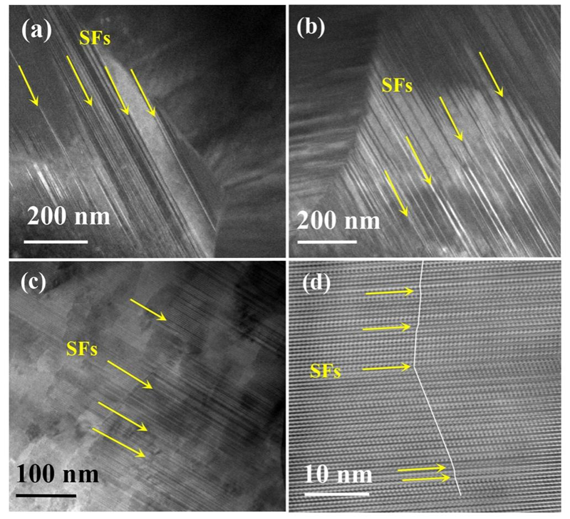 热电技术作为有望解决能源问题的新途径,近年来引起广泛关注。热电材料的转化效率由无量纲量热电品质因子ZT决定,ZT=S2σT/ (κc+κL), 其中S为热电势,σ为电导率,T为绝对温度,κc和κL 分别是载流子和晶格对热导率的贡献。Cu2SnSe3是一种组成元素廉价、环境友好的新型热电材料,但其较高的热导率和较低的功率因子PF (PF=S2σ) 限制了其ZT值的提升。目前对于Cu2SnSe3热电性能的优化主要是通过Sn位掺杂提高空穴浓度,然而这种掺杂会导致热电势的大幅下降和电子热导率的显著提升,使得ZT值的提升有限。此外,大多数研究只通过引入点缺陷或者球形纳米颗粒来散射声子,很少有利用堆垛层错或者具有大纵横比的纳米第二相来显著散射材料中的中低频声子(MLFPs)。