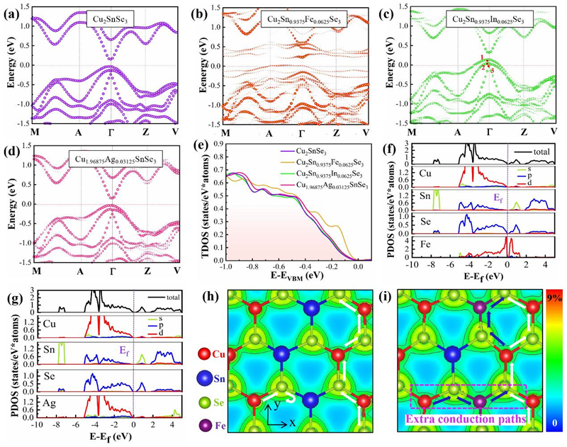 由于多元合金/化合物里MLFPs主导热输运,因此有效散射MLFPs是降低晶格热导率κL的关键。研究人员通过元素掺杂降低Cu2SnSe3的层错能 (图1)以及利用Ag2Se 与Cu2Sn0.88Fe0.06In0.06Se3的固相反应来分别引入高密度的堆垛层错和以[112]为轴的内生AgInSnSe4纳米针 (如图2和图3) 来有效散射MLFPs。第一性原理计算表明纳米针形成的内因是其 (1 1 2) 晶面具有高的表面能 (如图1)。理论分析发现,纳米针的纵横比是一个调控散射声子的额外自由度,通过改变纵横比可以散射不同频率的声子。平均径向尺寸为50nm、纵横比等于10的纳米针可以和堆垛层错一样显著散射MLFPs (如图4),结合点缺陷及其它散射机制实现对Cu2SnSe3声子的全频谱散射,使其晶格热导率在848K时降低至理论最小值~0.2WK-1m-1。与此同时,研究表明在Cu2SnSe3的Sn位掺Fe以及Cu位掺Ag可以增加价带顶的态密度,并且Sn位掺Fe还可以构建额外的空穴传输通道(如图5),这使其功率因子提升了3倍,在800K时达到了12μWcm-1K-2。最终,Cu2SnSe3的最高ZT值在848K时可达到1.61,是目前本体系报道的最高值 (如图6)。相关工作为Cu2SnSe3及其它热电材料的热电性能调控提供了新思路。