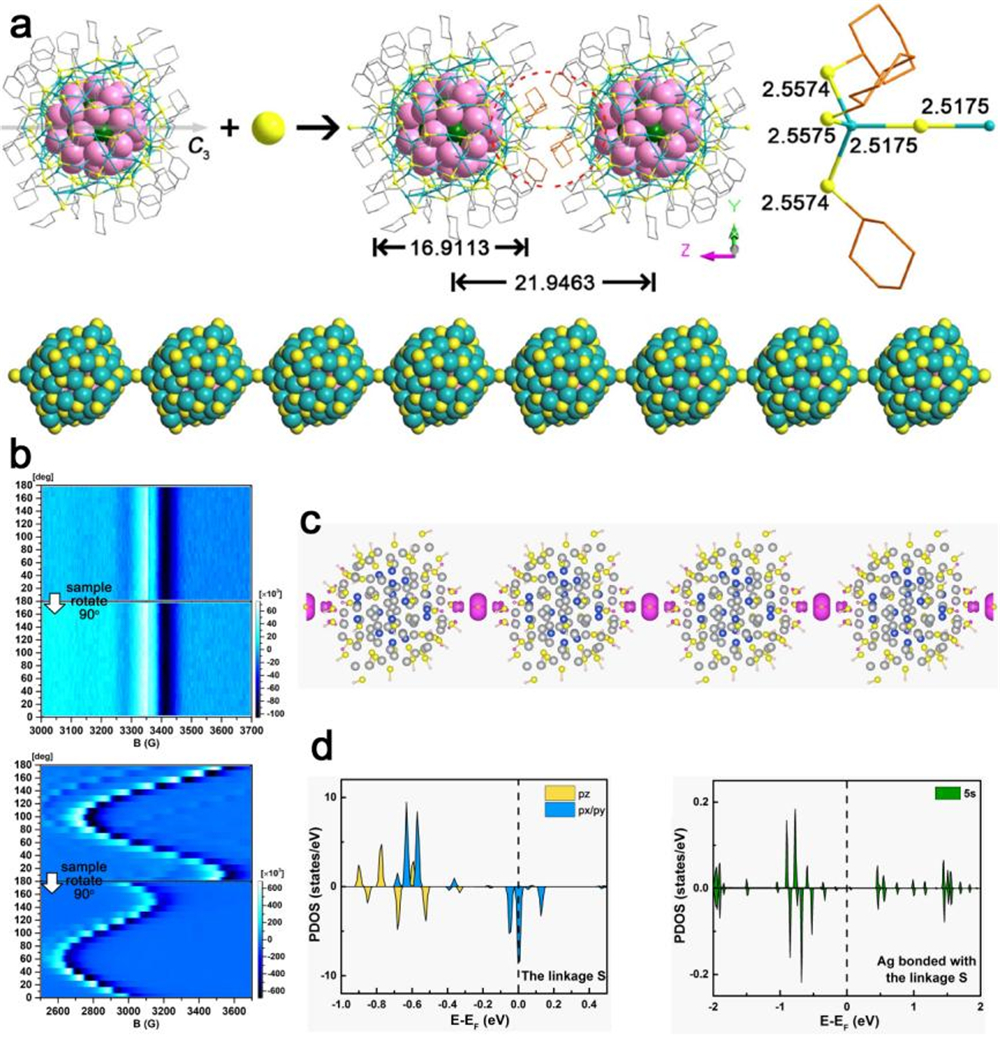图1. (a) Ag77Cu22团簇与硫形成的线性组装结构;(b) Ag77Cu22和Au250团簇的二维顺磁信号;(c) 线性组装结构的磁矩分布;(d) 连接处Ag和S的PDOS计算。