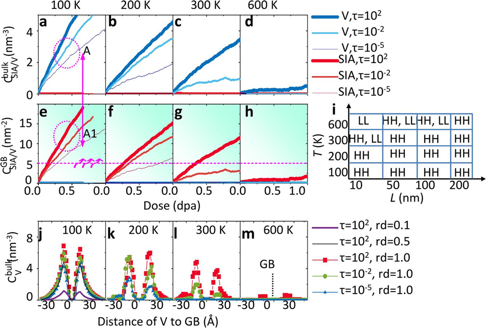 图2. (a-i) 块体和晶界中间隙/空位累积浓度随辐照剂量的变化;(j-m) 块体中空位浓度随空位-晶界距离的变化。