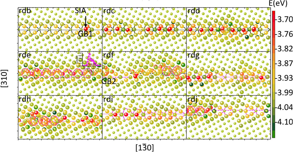图3. 不同辐照剂量下弛豫后的晶界结构。