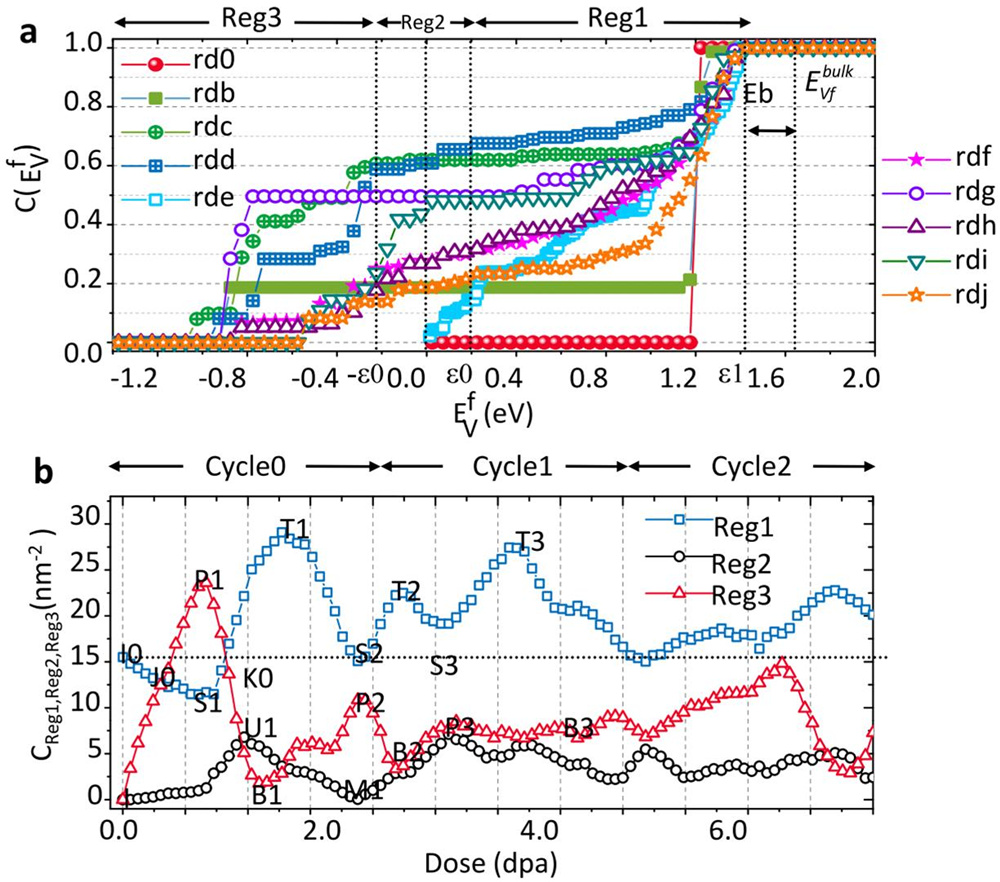 图4. (a) 不同辐照剂量下几个晶界体系中空位形成能的累积分布函数,符号Reg1、Reg2和Reg3分别表示具有不同位点稳定性的三个区间,此稳定性由该位点空位形成能表征;(b) 不同区间其相应位点密度随辐照剂量的变化。