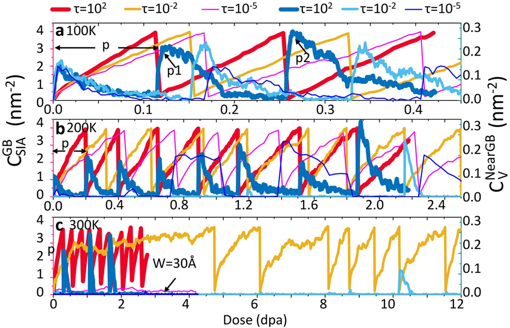 图5. 晶界处间隙浓度(左轴)和晶界附近空位浓度(右轴)随辐照剂量的变化。