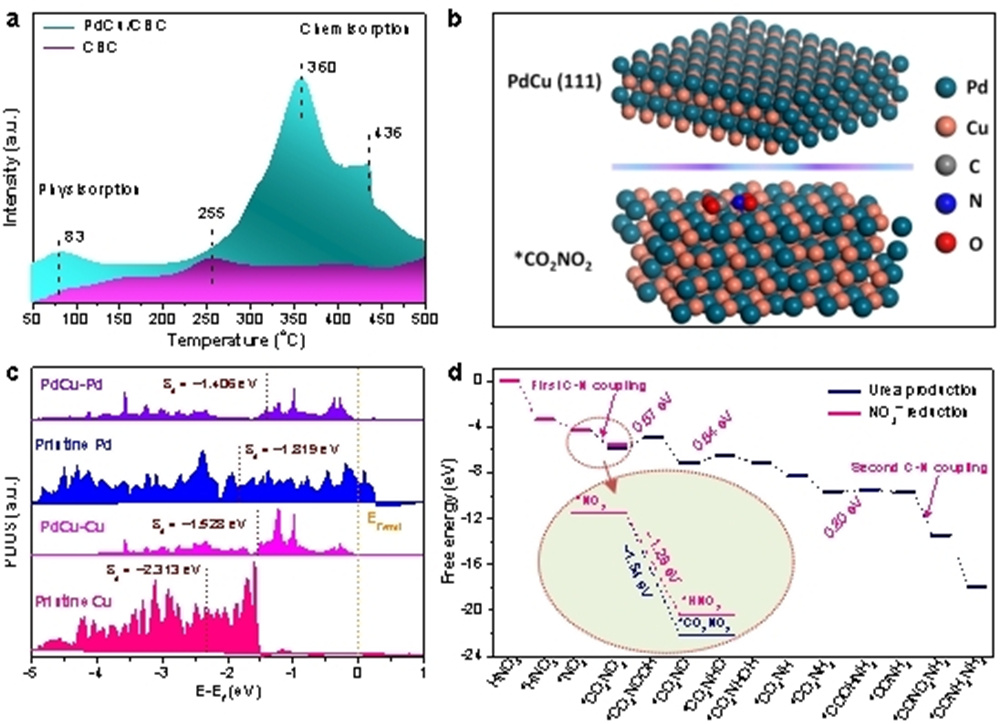 图2. (a) PdCu/CBC 和CBC样品的CO2-TPD图;(b) DFT计算优化的Pd−Cu合金 (111)晶面和中间体*CO2NO2结构图;(c) 双金属Pd−Cu、单金属Pd和单金属Cu的Pd-4d或Cu-3d轨道的态密度图,虚线表示Pd或Cu原子的d带中心,费米能级设置为0 eV;(d) DFT计算PdCu/CBC电催化合成尿素途径的吉布斯自由能图。