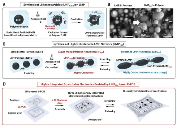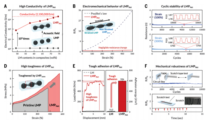 近期,韩国科学技术院Jiheong Kang团队设计出了一种高性能液态金属基的导电弹性体的制备方式。利用该方法利用声场对分散有液体金属粒子弹性导体复合材料内的液态金属粒子进行组装,形成液态金属粒子网络。由于液态金属粒子的尺寸效应,这种导电复合材料克服了液态金属泄露的问题。其次这种具有液态金属粒子网络的渗流结构和变形机使得在高变形下复合材料仍然具备高导电性,印刷有这种材料的柔性电路板在二维拉伸的情况下难以察觉的电阻变化。并且实现了在大于4000%的形变下,电阻变化仍可以忽略不计。这种方式还可以在各种聚合物基质中生成液态金属粒子网络,包括水凝胶、自愈合弹性体和光阻剂,从而显示出它们在柔性电子设备中的应用潜力。该工作以题为“Universal assembly of liquid metal particles in polymers enables elastic printed circuit board”的文章发表于Science上。昆士兰大学乔瑞瑞(音译)和英国伯明翰大学工程系助理教授唐诗杨同期在Science发表题目为“Connecting liquid metals with sound”评论文章。