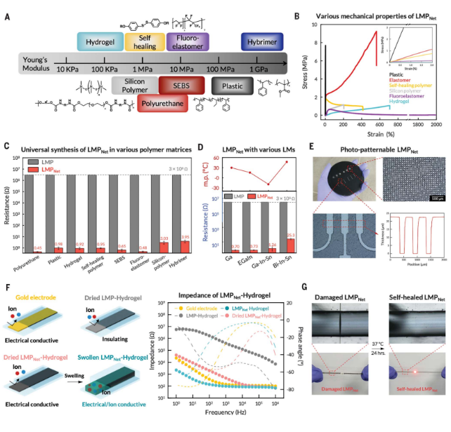 这种基于声场形成液态金属粒子网络的策略适用于大多数聚合物基质。通过实验成功地在超过15种具有不同化学和机械性能的不同聚合物中形成了液态金属粒子网络。我们还使用其他具有不同熔化温度和组成的液态金属合金证实了液态金属粒子网络的形成。所有的液态金属粒子网络体系都表现出高导率。