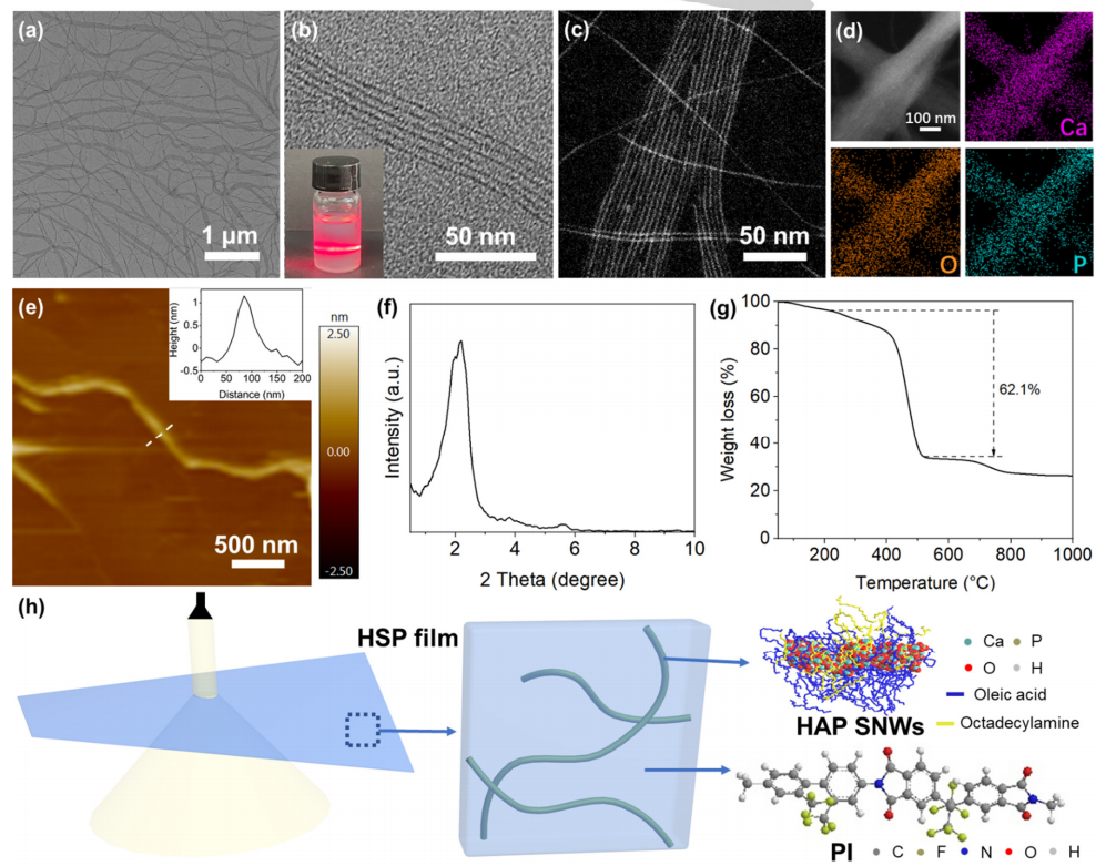 亚纳米纤维是指一种直径小于1 nm、接近聚合物链直径的纳米线。当纳米结构的尺寸降至低于1纳米的尺度时,亚纳米纤维表面原子比接近100%,因此,聚合物和亚纳米纤维之间的相互作用将大大增强,通过这种分子层面的强相互作用,亚纳米纤维与聚合物分子链可以形成三维网络和凝胶,极大地提高聚合物的力学性能。羟基磷灰石亚纳米纤维主要由钙、磷和氧组成,其直径约为1.2 nm,并且可以均匀地分散在溶剂中,并具备丁达尔效应。