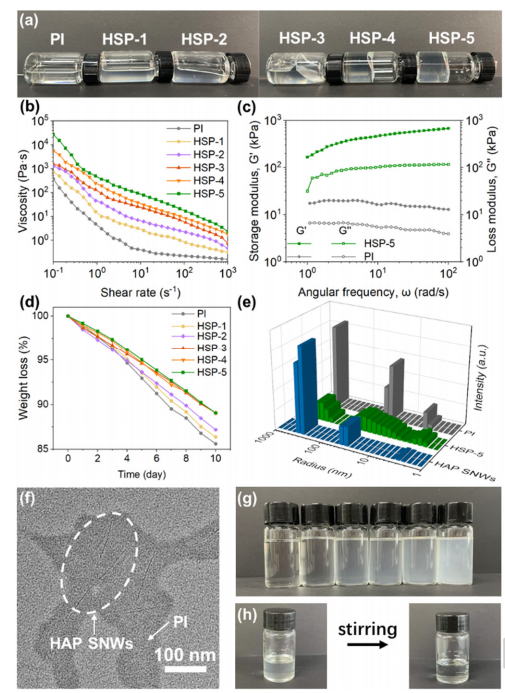 羟基磷灰石亚纳米纤维与聚合物由于配位作用可以交联形成三维网络。随着羟基磷灰石亚纳米纤维含量的增加,凝胶变得越来越粘稠,其表现出剪切变薄的特性,表明其具有非牛顿流体行为。透射电镜图像显示了凝胶的形态。羟基磷灰石亚纳米纤维在聚酰亚胺中均匀分散并且随机取向。由于羟基磷灰石亚纳米纤维的加入会引起了凝胶的雾化。在搅拌30天后,HSP-凝胶与其原始外观相比会变得清晰和透明,这是羟基磷灰石亚纳米纤维定向取向的结果。