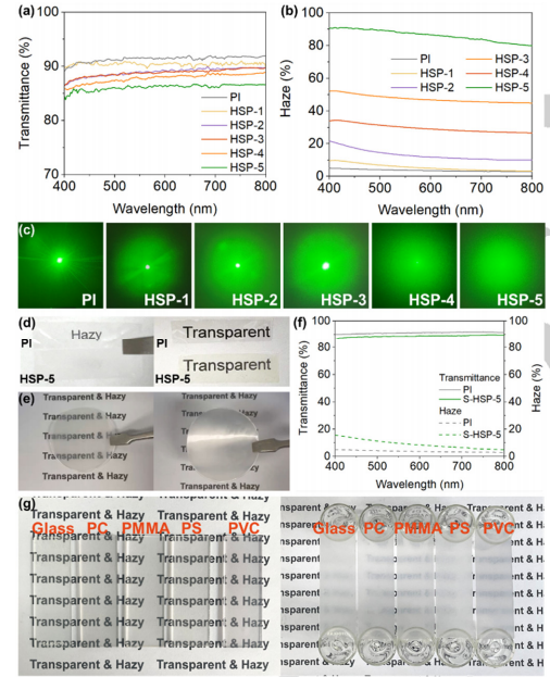 复合薄膜在可见光区域表现出较高的透明度,由于其透光率均匀连续,超过85%。亚纳米线和聚合物链由于在尺寸上的相似,因此两种材料具有相似的透光率,导致复合薄膜的高透明度。HAPsnw同时可以实现漫射光,使得复合薄膜呈现雾状。通过调整HAPsnw的含量,可以控制薄膜的雾度,最大值可达到85%左右。并且,这种材料可与涂敷在多种基底上,实现透光和雾度的调控。
