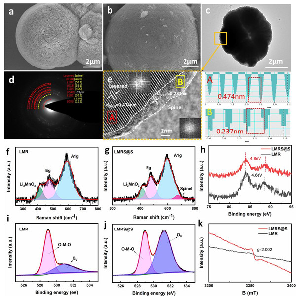 图1. (a) LMR和(b) LMRS@S的SEM图像;(c, d) LMRS@S和相应的SEAD的TEM图像;(e) LMRS@S的HRTEM图像;(f, g) LMR和LMRS@S的拉曼光谱及其拟合结果和(h) Mn 3s和(i, j) O 2p的XPS光谱;(k) LMR和LMRS@S的室温EPR结果。