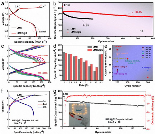 图2. (a) 0.1C时材料的首次放电曲线;(b, c) 1C时的循环性能和相应的充放电曲线;(d)倍率性能图;(e)与之前报道的具有代表性的LMRs改性研究之间的电化学性能比较;(f)全电池前三个循环的充放电曲线;(g) LMRS@S||石墨全电池的循环性能。