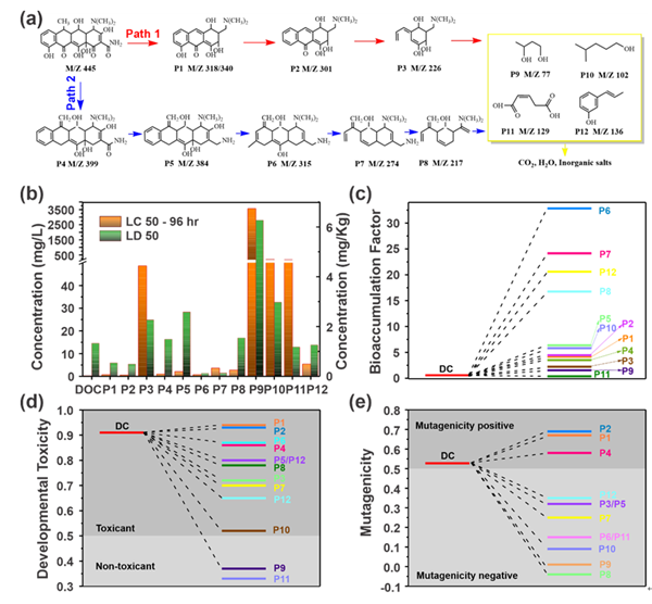 图3. 四环素降解的路径分析以及其产物的鉴定和毒性评估。