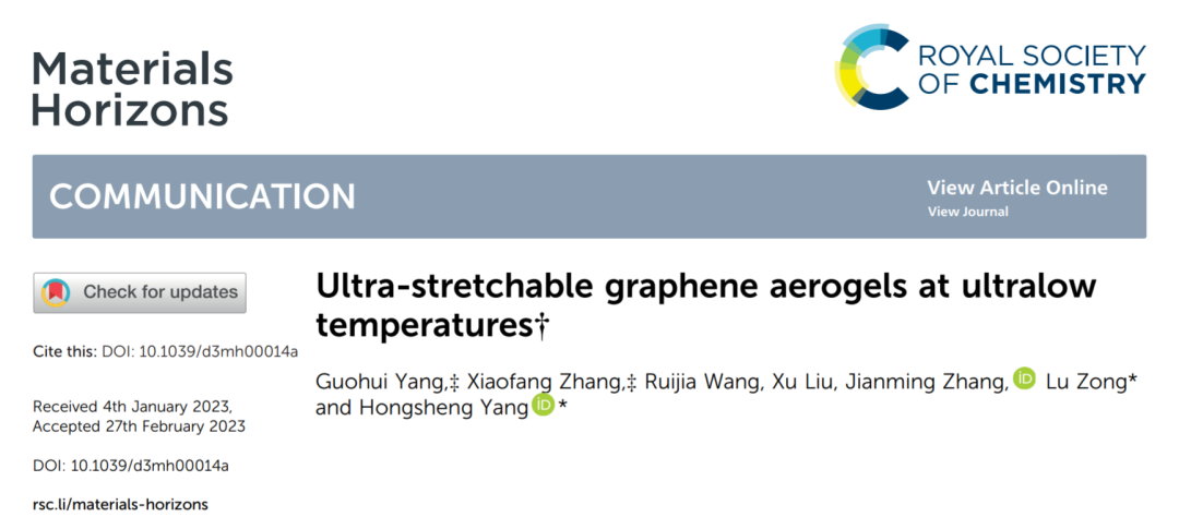 近日,青岛科技大学高分子学院张建明教授团队等在材料领域知名期刊《Materials Horizons》(影响因子15.717,中科院分区材料1区)发表了题为“Ultra-stretchable graphene aerogels at ultralowtemperatures”的研究论文(DOI: 10.1039/d3mh00014a)。高分子学院硕士研究生杨国徽和张晓方副教授为共同第一作者,杨洪生副教授和宗鲁副教授为共同通讯作者。