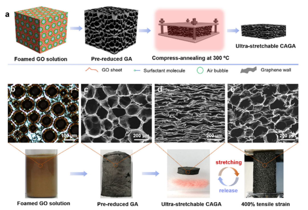 图1、超拉伸石墨烯气凝胶制备过程。