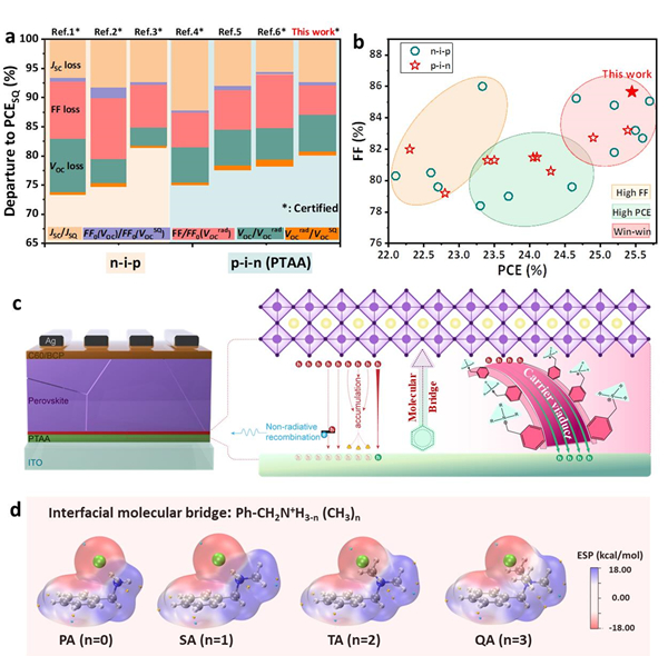 1.(a)根据S-Q理论,对基于PTAA为HTM的正式(n-i-p)和反式(p-i-n)钙钛矿太阳电池的效率损失分析;(b)不同构型的高效钙钛矿太阳电池的填充因子(FF)和效率(PCE)记录;(c)载流子管理机理示意图;(d)界面分子构型以及表面静电势。