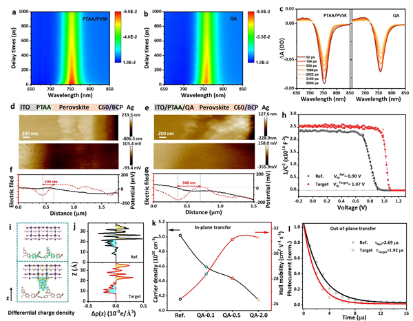 基于此,研究人员对PTAA/钙钛矿异质界面的局部电位进行可视化处理,并研究了其对器件性能的潜在影响。研究发现,PSCs堆叠界面处的局部静电电位分布对载流子传输和层间提取至关重要,可以通过对其进行精细调节以获得有利的载流子行为。因此,科研人员采用密度泛函理论(DFT)计算和截面KPFM直接评估局部静电电位分布,并提出了由Ph-CH2N+H3-n(CH3)n组成的界面分子桥策略(其中n是取代度),其中-N+H3-n(CH3)n基团优先插入钙钛矿中框架,苯基垂直向下朝向钙钛矿基底。最稳定的苯甲胺三甲基盐酸盐(QA)分子桥构型实现了定向载体管理并重新分配均匀的静电环境,协同钝化界面缺陷。研究结果表明,构建坚固的钙钛矿基底异质界面可降低电阻损耗,并实现载流子选择性。