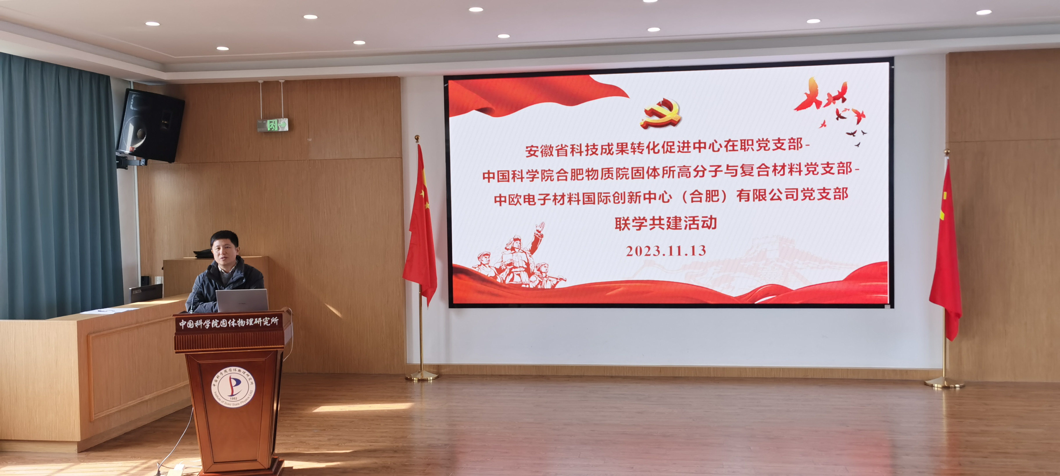 2023年11月13日,江南官方网站_江南online(中国)(合肥)有限公司党支部与安徽省科技成果转化促进中心在职党支部、固体所高分子与复合材料党支部开展了联学共建主题党日活动。本次联学共建活动以“科技创新与科技成果转化”为主题,分为参观学习和座谈交流两个环节,固体所党委书记田兴友、安徽省科技成果转化促进中心副院长屈昊、江南官方网站_江南online(中国)(合肥)有限公司党支部书记葛苗等共计50余位党员参加活动。