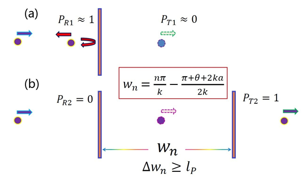 图2. (a)微观粒子被单势垒几乎完全反射;(b)满足给定势垒间距的条件下,同样的微观粒子在双势垒之间发生共振隧穿。其中,势垒变化步长不小于普朗克长度lP。