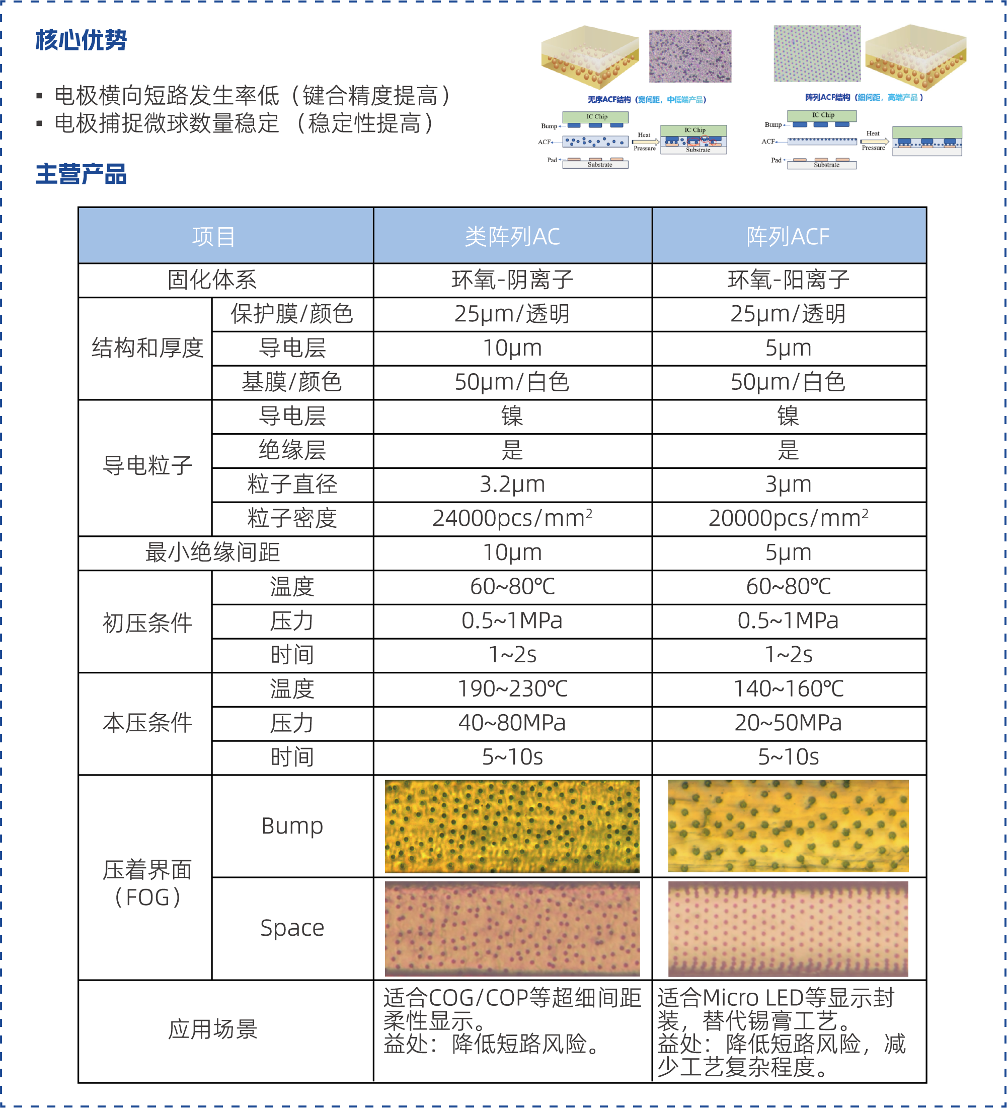 各向异性导电胶膜(ACF)利用导电粒子连接芯片与基板使之导通,又避免相邻两电极短路而只在Z轴方向导通。目前这种材料被国外技术所垄断。本项目致力于各向异性导电胶膜的技术开发和国产化。