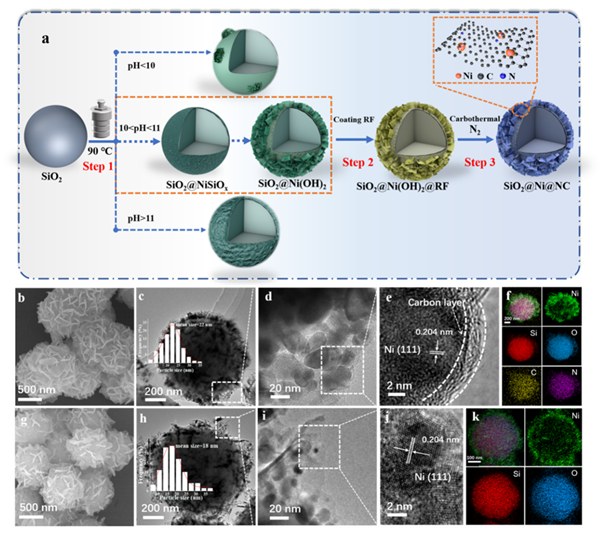 图1. (a) SiO2@Ni@NC的合成示意图;SiO2@Ni@NC催化剂的(b) SEM, (c, d) TEM, (e) HRTEM和(f) EDS能谱图; SiO2@Ni催化剂的(g) SEM, (h, i) TEM, (j) HRTEM和(k) EDS能谱图。