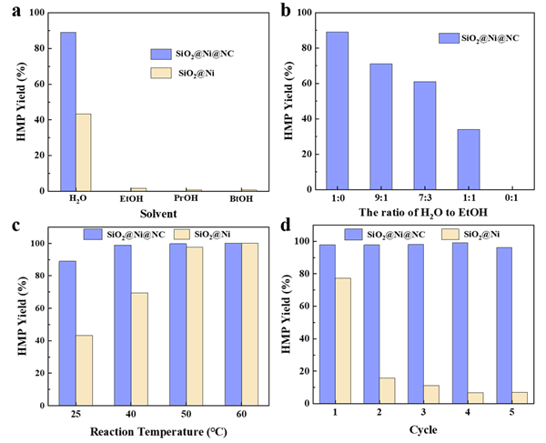 图2. (a)不同溶剂下SiO2@Ni@NC和SiO2@Ni催化剂的反应性能;(b)水和乙醇的体积比对SiO2@Ni@NC催化剂的反应性能的影响;(c)反应温度对SiO2@Ni@NC和SiO2@Ni催化剂性能的影响;(d) SiO2@Ni@NC和SiO2@Ni催化剂的水相稳定性。