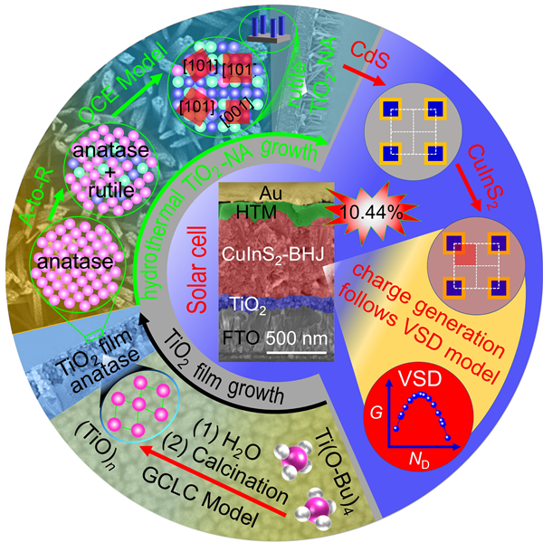 (3)由于较大的锐钛矿TiO2纳米颗粒易发生原位A-to-R相变,TiO2-NA中ND可以通过tH得到有效调控。研究人员通过调控tH,结合一定的水热反应条件,在不改变直径和长度的情况下,实现了对TiO2-NA中的ND进行有效调控。进一步将ND调控的TiO2-NA用于构筑CuInS2太阳电池,提出了体积-面积-密度(VSD)多参数耦合模型,定量揭示了ND与光电流产生相关性的物理原理,首次在低温条件制备了效率大于10%的CuInS2太阳电池,并创造了新的CuInS2太阳电池光电转换效率记录(10.44%)。该VSD多参数耦合模型为设计体型异质结结构光电器件提供了理论基础。